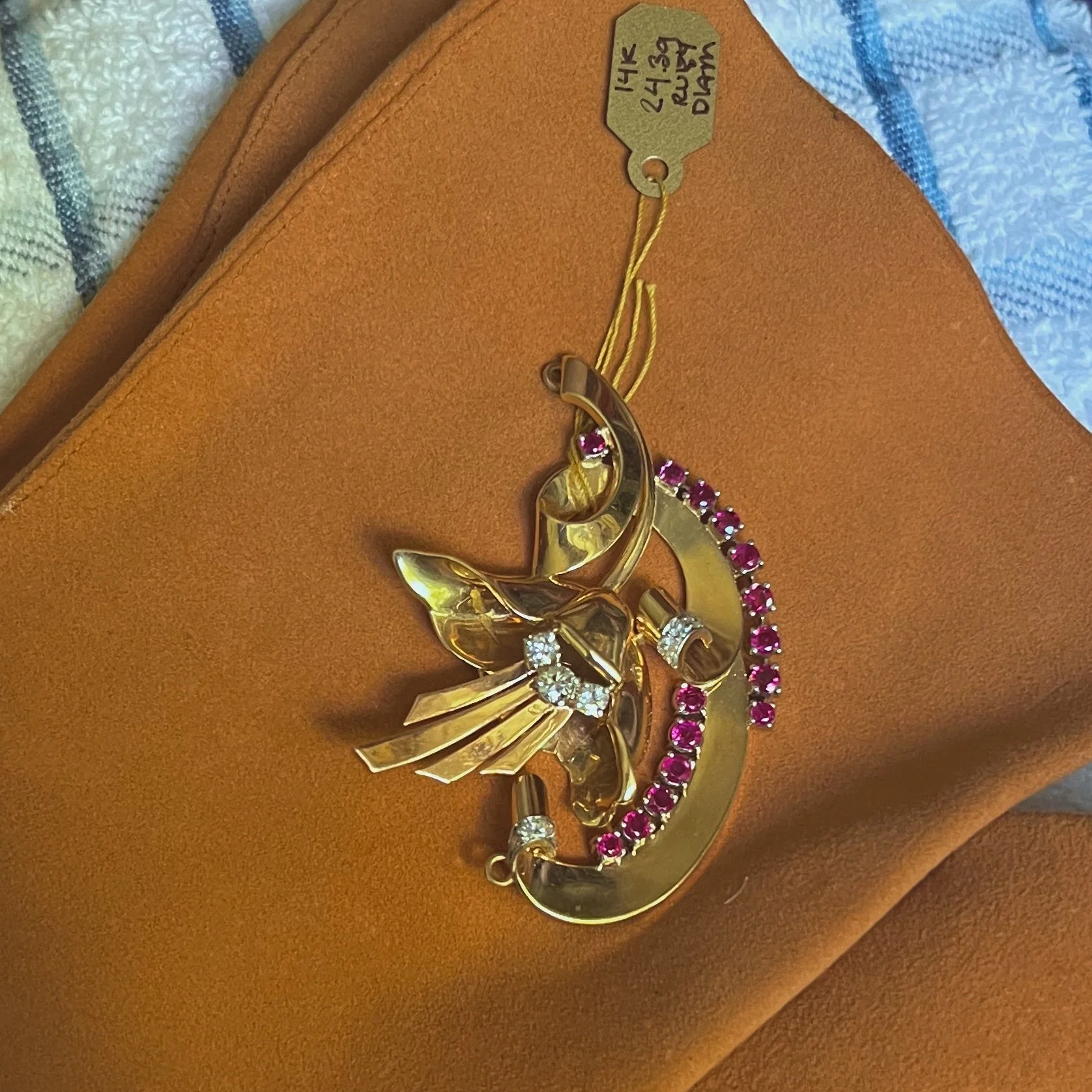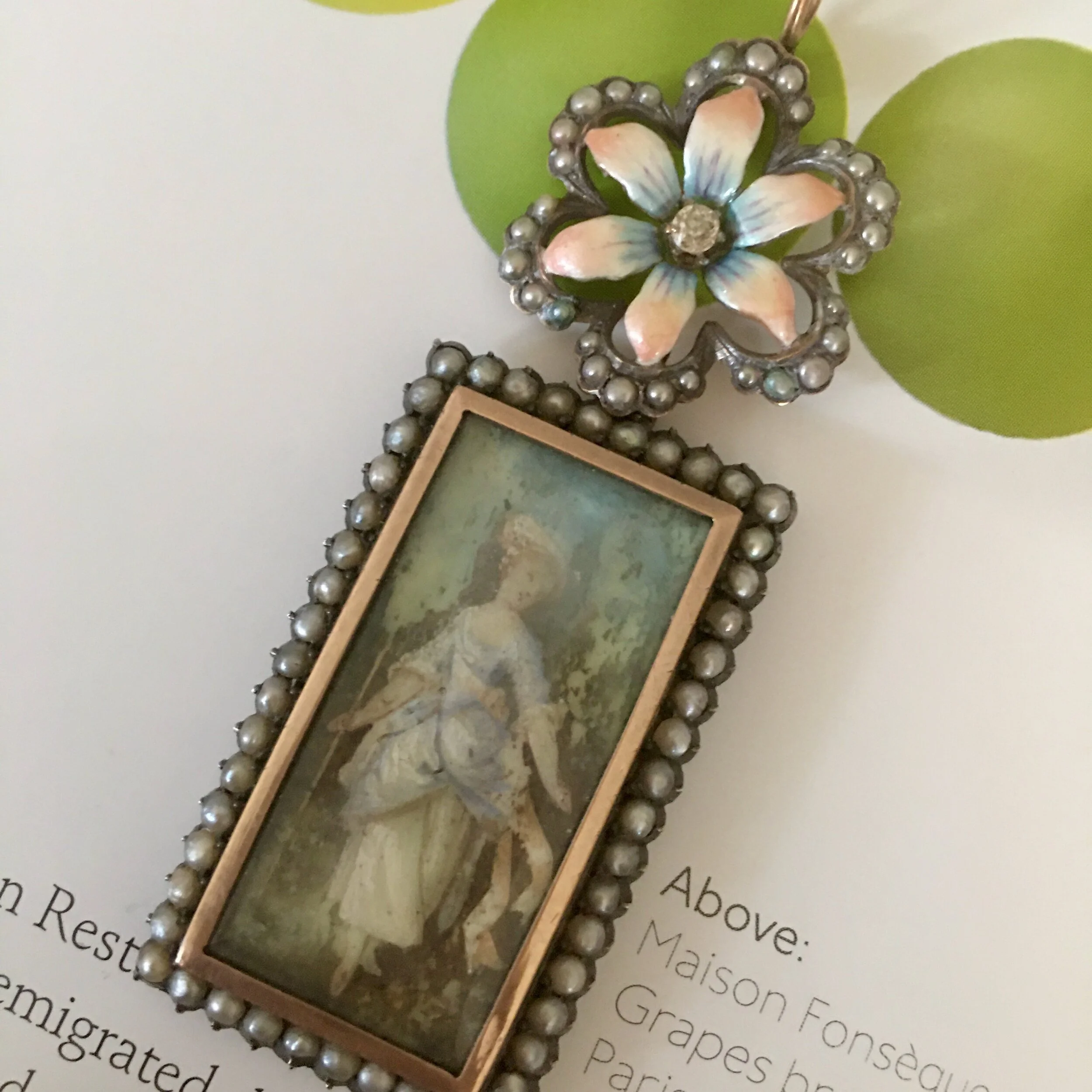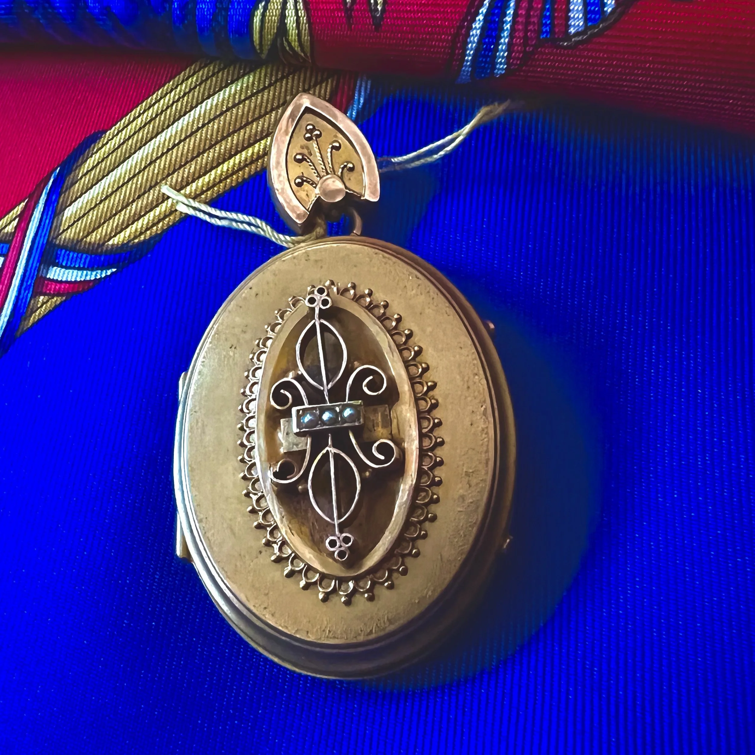 **Top Image: If you think it looks real… it is! In the 19th century, beautifully iridescent beetles were often captured and used as a primary part of a piece of jewelry. This one happens to be framed in Italian gold wire work. If you look at the inside you’ve got all the beetle innards, but the shimmer and iridescence of the natural beauty beetle beauty is astounding. Price Group A